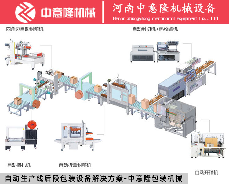 As a packaging machinery manufacturer, Henan Zhongyilong Company has many years of experience in designing and manufacturing packaging equipment such as unboxing machines, packing machines, sealing machines, palletizing machines, heat shrink film packaging machines, and fully automatic box packing machines. Product production is centered around customer production needs, providing technical solutions for cardboard packaging machines and designing customized packaging machinery to meet the needs of different customers.